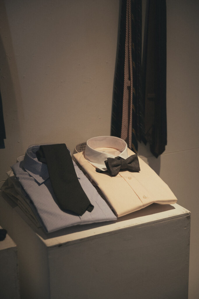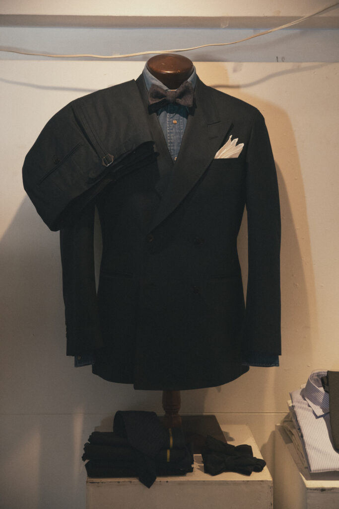 かなり攻めたスタイリングですが、ボウタイはウールデニムなので野暮ったくなく、